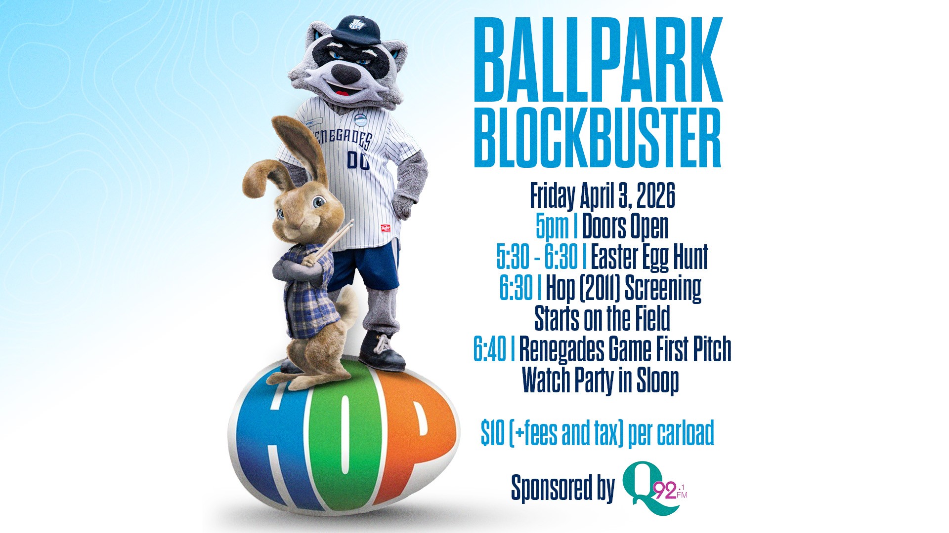 Join us at Heritage Financial Park for a Ballpark Blockbuster: Hop on the big screen! Come early for a special Easter Egg Hunt on the field before the movie begins. We’ll also have the Renegades’ season opener vs. the Cyclones playing on the TVs in the Sloop Brewing Co. Beer Balcony.