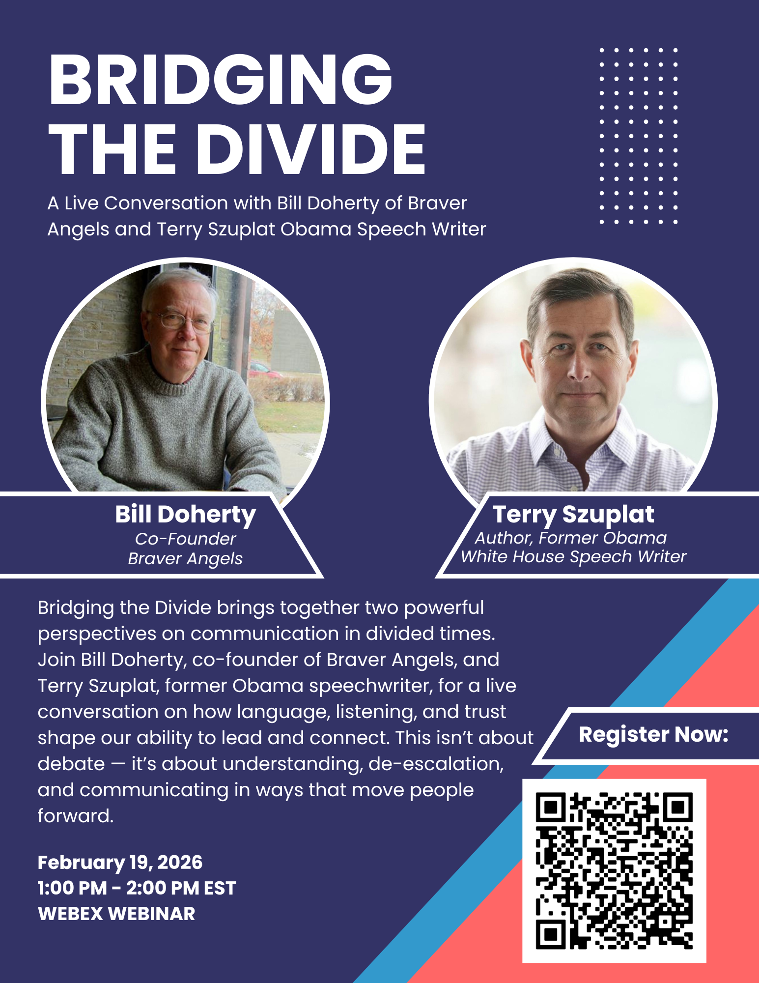 On February 19th | 1:00–2:00 PM EST, I’ll be joined by Bill Doherty, co-founder of Braver Angels, and Terry Szuplat, author and former White House speechwriter to President Obama, for a live conversation on bridging divides through language, listening, and leadership.