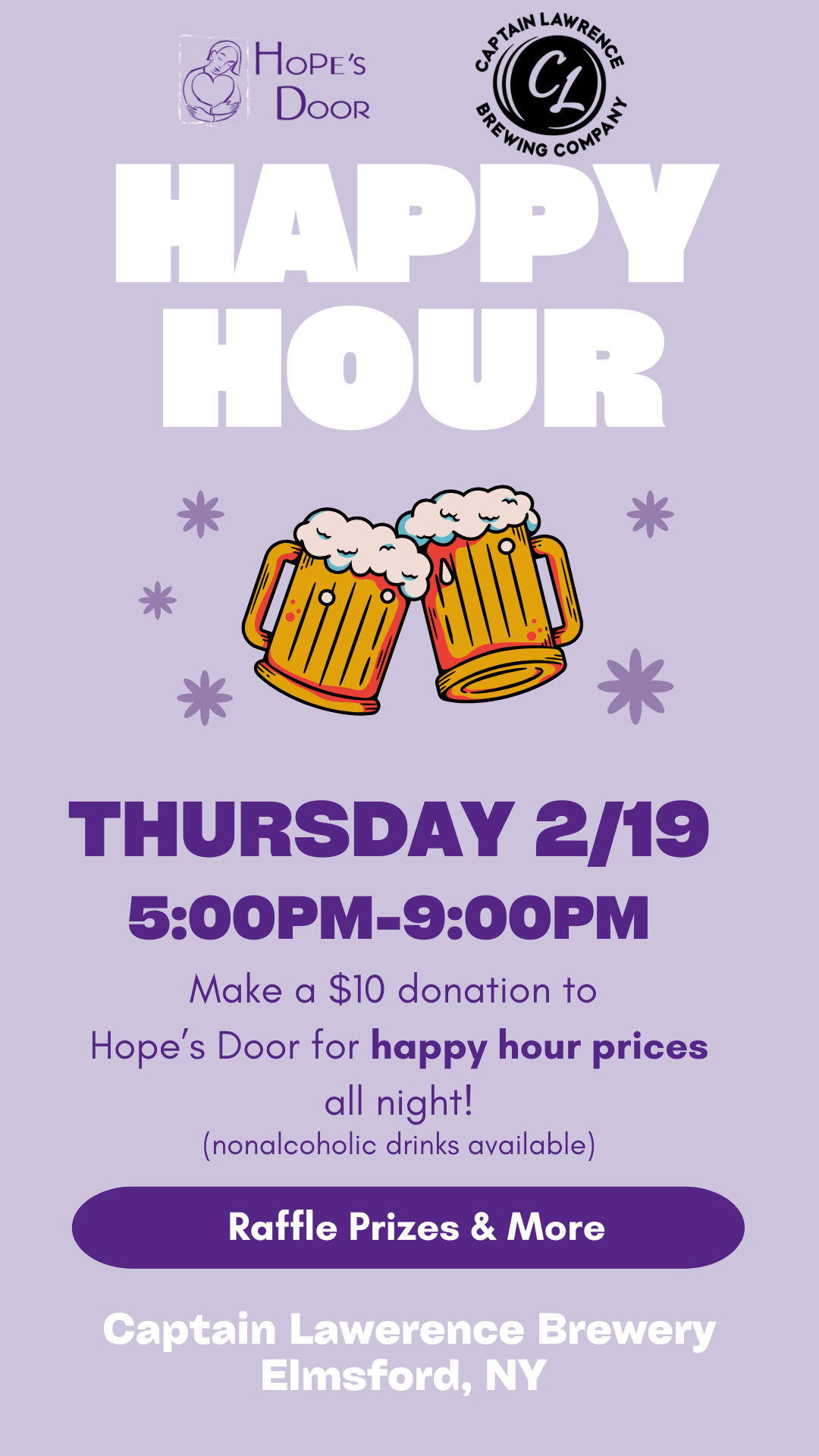 Join Hope’s Door on Thursday, February 19th for Happy Hour at Captain Lawrence Brewery in Elmsford, NY!