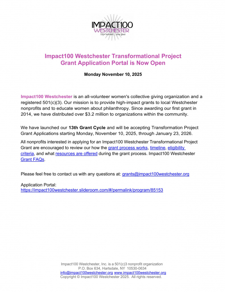 Impact100 Westchester Transformational Project Grant Application Portal Opens Monday November 10, 2025