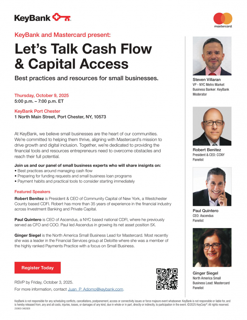 KeyBank would like to invite you to an event that we were having at our Port Chester Branch, on Thursday, October 9, 2025. This event will focus on best practices around managing cash flow, preparing for funding request and small business loan programs, and payment habits and practical tools to consider immediately. Kindly let us know if you would like to join us so we can RSVP you. Please feel free to share with other business owners that may have an interest to join as well. Space is limited to please register as soon as possible.