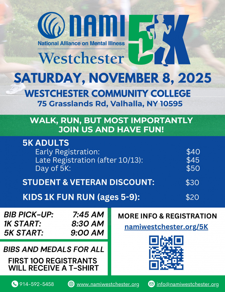 Join NAMI Westchester for their Fall 5K on Friday, November 8 at Westchester Community College – a family-friendly event supporting free mental health programs in the community.