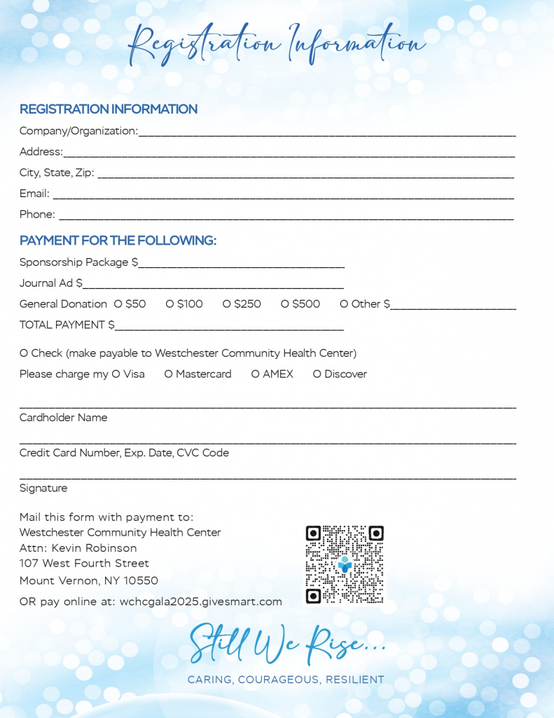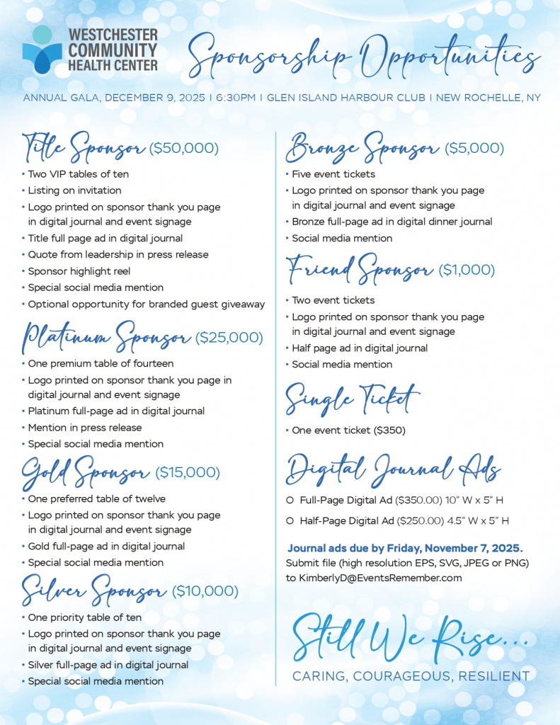This year’s WCHC 2025 Gala “Still We Rise: Caring, Courageous, Resilient” will bring together community leaders, healthcare partners, and organizations who support our mission of improving healthcare access for the residents of Westchester County and the North Bronx. As WCHC’s largest fundraising event of the year, the gala helps sustain and expand programs that address critical health needs across our nine sites, including our Mobile Health Unit.
