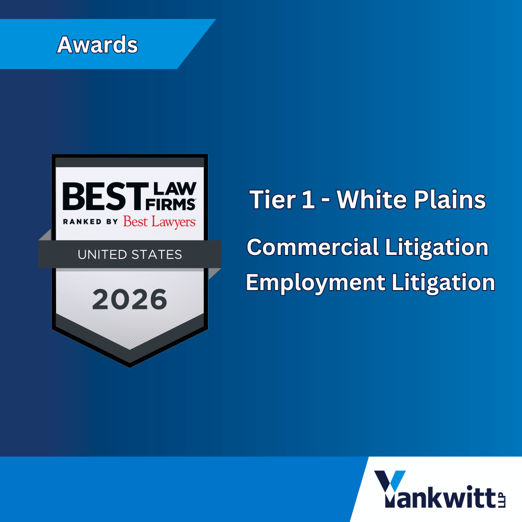 White Plains, NY (November 6, 2025) – Yankwitt LLP, Westchester County’s go-to law firm for high-stakes, bet-the-company litigation, has been ranked a Tier 1 firm in the 2026 Best Law Firms for Commercial and Labor & Employment Litigation in White Plains.
